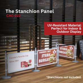 Stanchion sign frames, post sign holders, and sign display cases for stanchions make communications to customers and customer-guiding in more effective ways. The portable and 360-degree displayable design allows retail stores, restaurants, airports, hotels, museums, facilities, etc. to advertise and display messages when managing the crowd with retractable belt barriers.